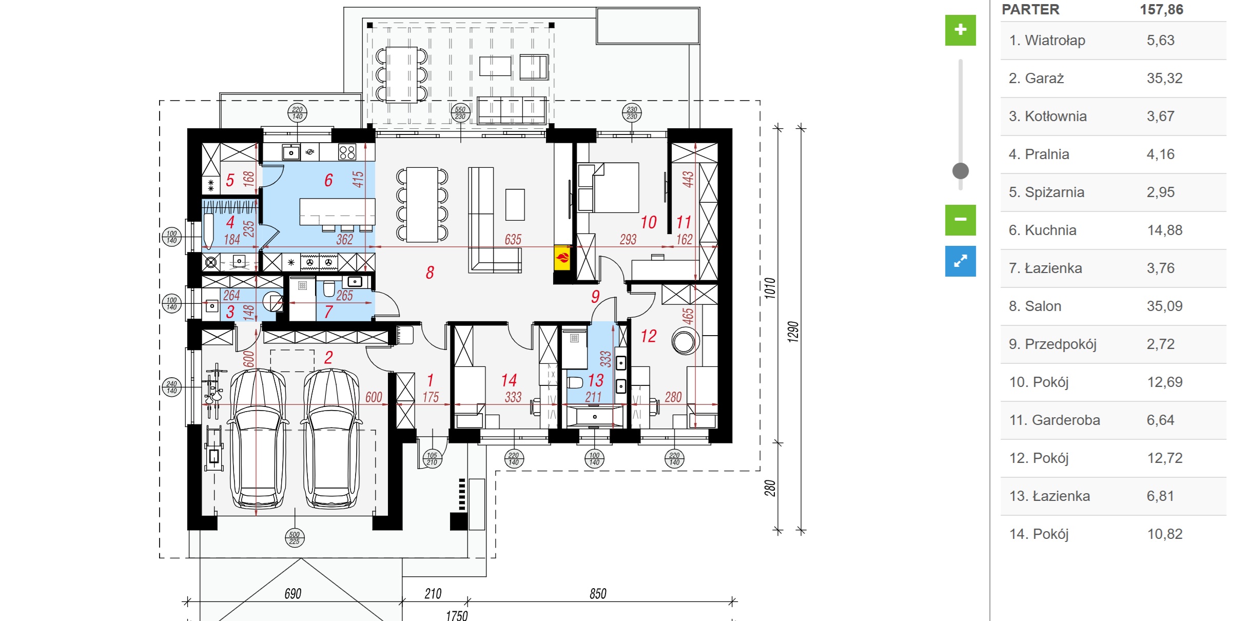 Przemyślany układ pomieszczeń z dużym salonem, kuchnią, spiżarnią, 3 sypialniami, dwiema łazienkami, pralnią i garażem na dwa samochody. Dodatkowo poddasze z możliwością adaptacji.